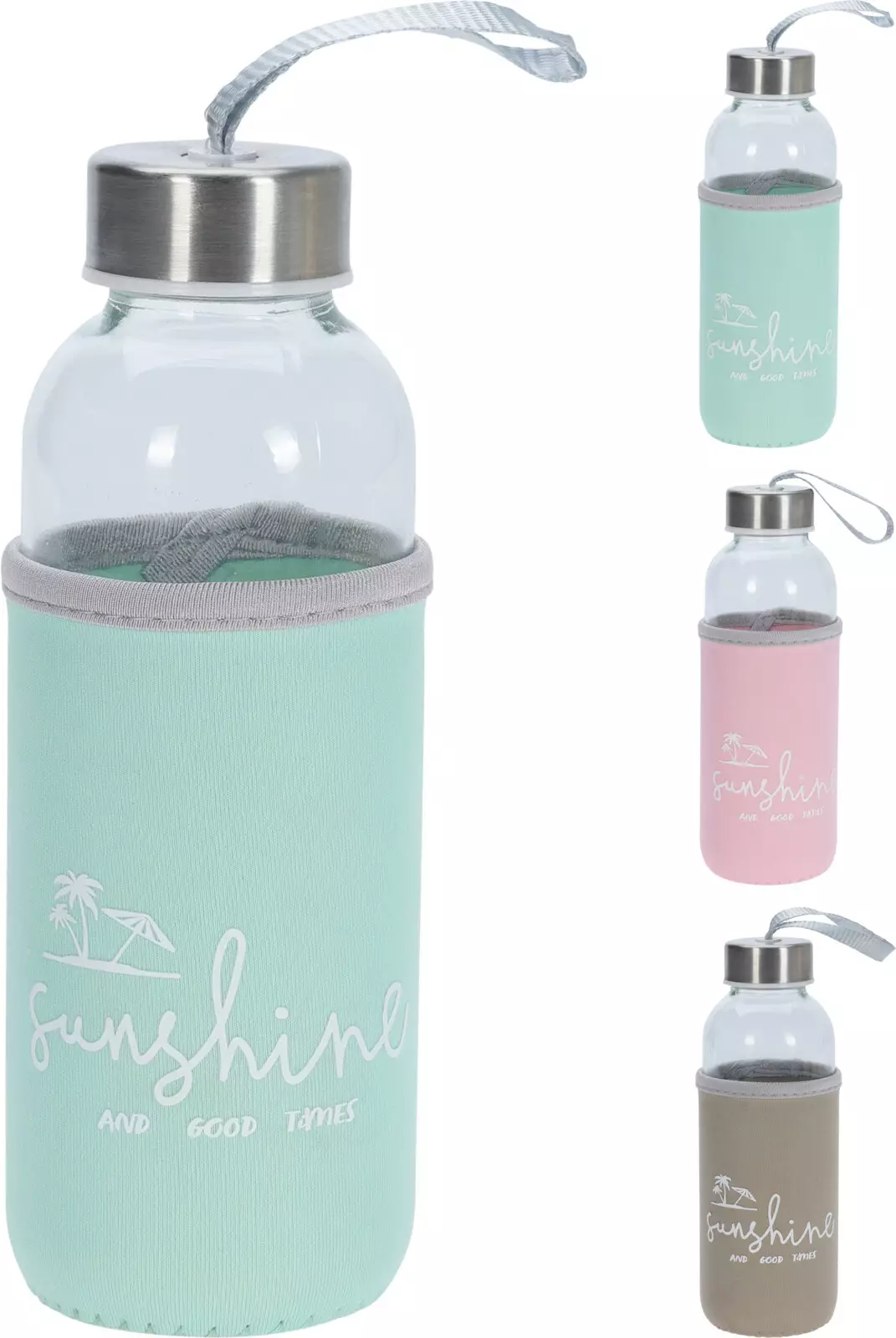 Glasflaska, volym 400 ml. Flaskan är utrustad med ett skruvlock av rostfritt stål och ett bärhandtag. Levereras med ett neoprenskydd med texten "sunshine and good times" samt en palmillustration. Finns i mintgrön, rosa, grå och beige. Enkel och modern design som passar för vardagligt bruk.