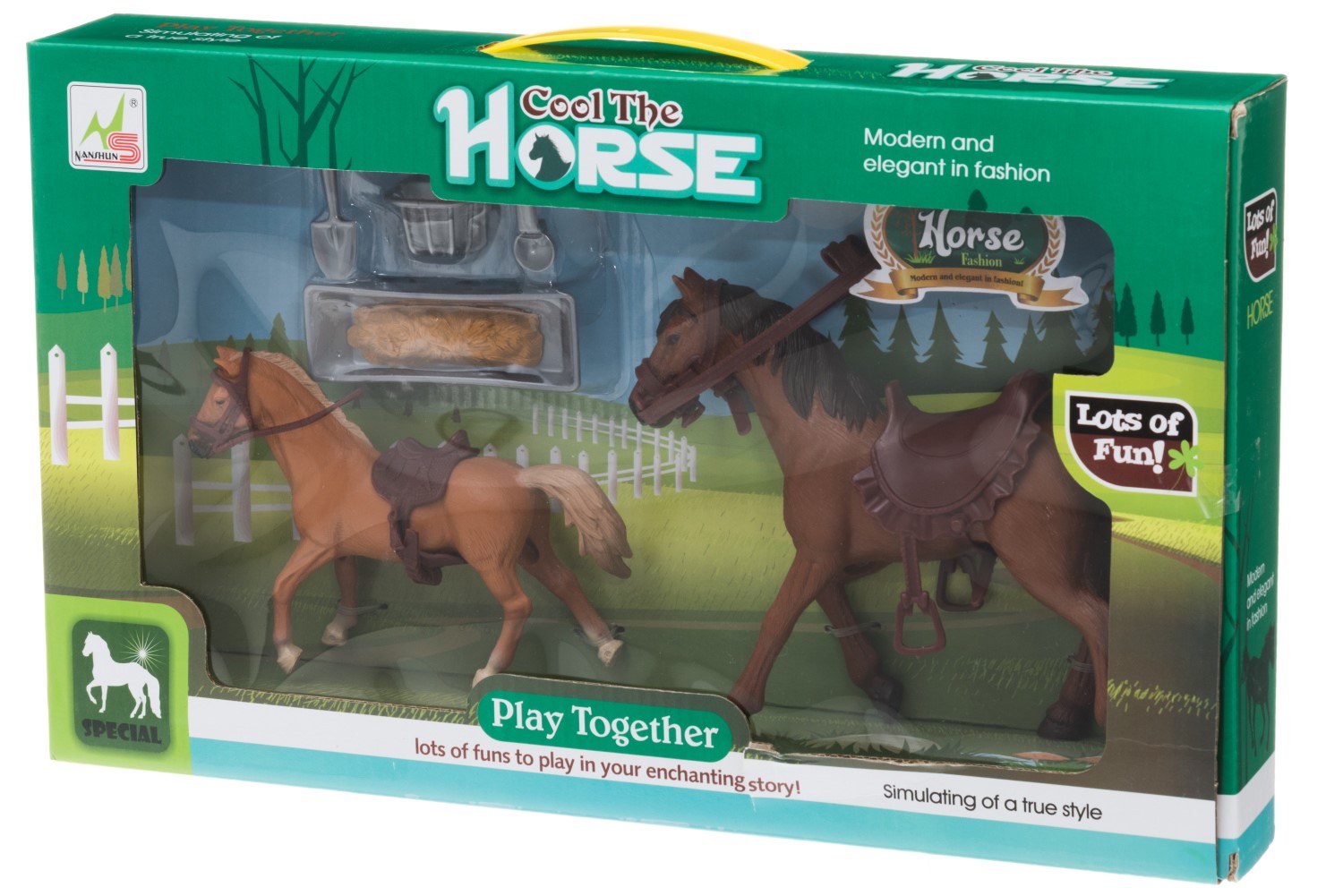 Setet innehåller en liten och stor häst, en höbal och annan utrustning. Åldersrekommendation 3+.