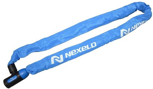 Nexelo kedjelås är utrustat med en slitstark och högkvalitativ kedja med ett textilskydd för att skydda hjul och ramen. Låssatsen innehåller två nycklar. Låset har en diameter på 6 mm och en längd på 1200 mm. Färg blå, vikt 815g.