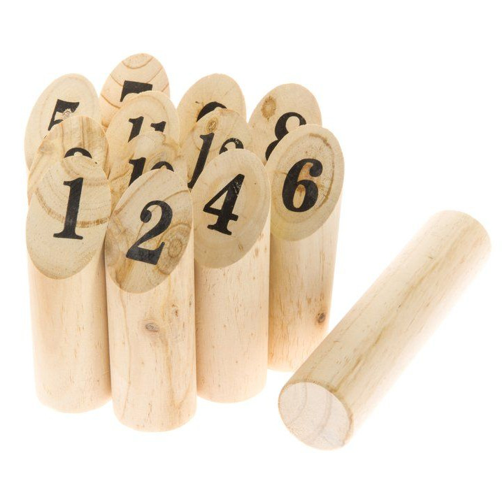 Klossar i furu (140 x 45 mm) och kastblock (240 x 45 mm) förpackade i en nätpåse. Paketet innehåller spelinstruktioner.