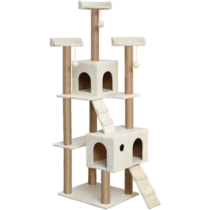 Det flerskiktade och höga kattklätterträdet är en rolig plats att leka och vila för katten. Den nedre delen av klätterställningen har trä vilket gör stommen stabil. Stängerna på klätterträdet är täckta med högkvalitativt sisalrep och resten av ställningen är mjuk plysch. Stativet har flera nivåer för klättring och observation, samt två bon där katten kan vila. Notera levereras i delar.