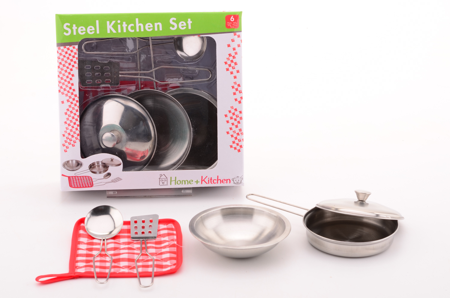 Ett riktigt snyggt kitt i metall till köket! Detta kit på 6-delar innehåller en stekpanna, lock, skål, stekspade, grytlapp och slev!