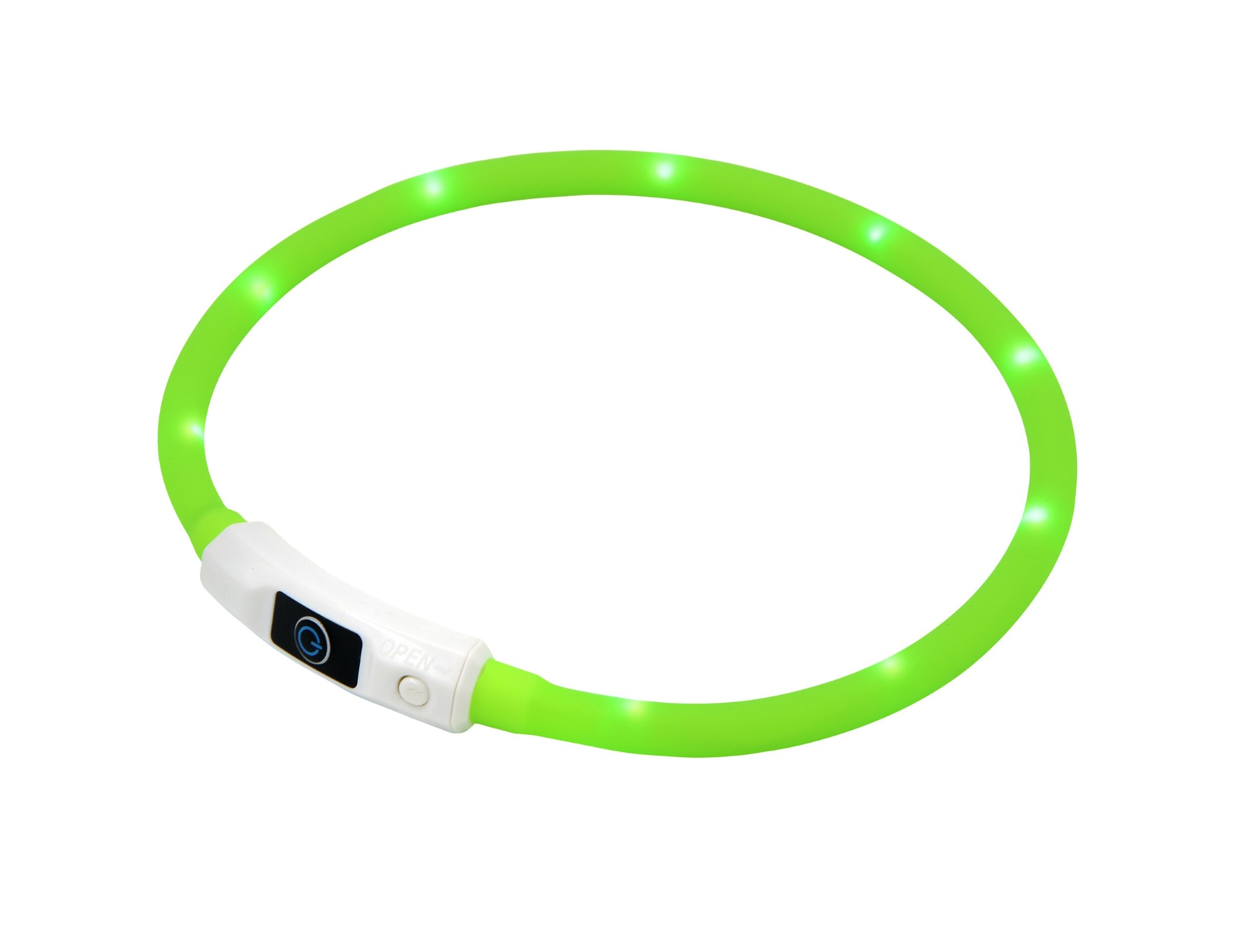 USB uppladdningsbart led-ljushalsband för hundar. Kragen är gjord av lätt, mjuk och flexibel silikon. Max mått 70 cm, kragen kan kortas av för att passa. Kontinuerligt eller blinkande ljus som ljusfunktion.