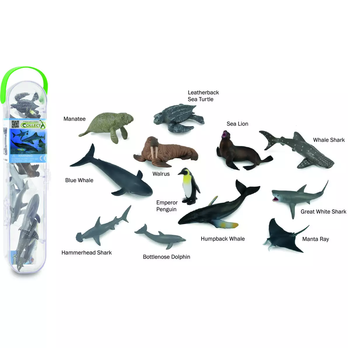 CollectAs minihavsvarelser i tub innehåller tolv handmålade havsdjursfigurer. Detta djurset erbjuder en mångsidig samling av havsvarelser som väcker barnens intresse för marinbiologi och uppmuntrar till lärorik lek.
