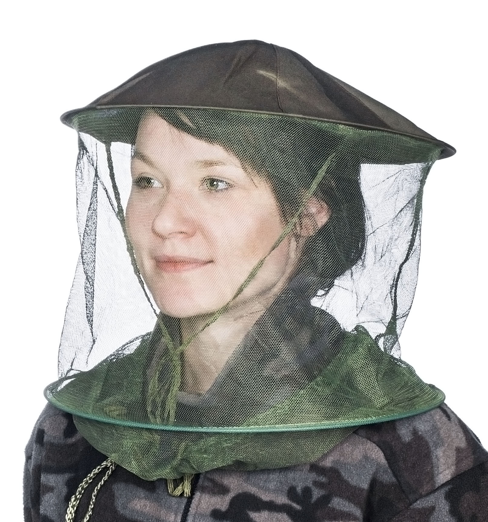 Mössmössa med myggnät, håller myggor och rådjursflugor borta. Bågarna i hatten håller nätet borta från huden. Diametern på fälgarna är ca 32 cm. Sladdfäste i nacken.