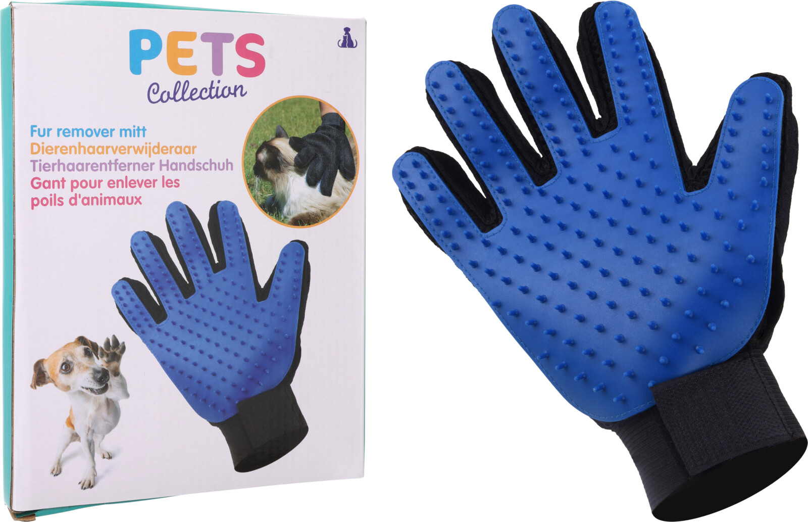 Borsten på borsthandsken masserar husdjurets hud samtidigt som de tar bort löst hår. Vid handleden, elastiskt band med kardborreband som kan dras åt.