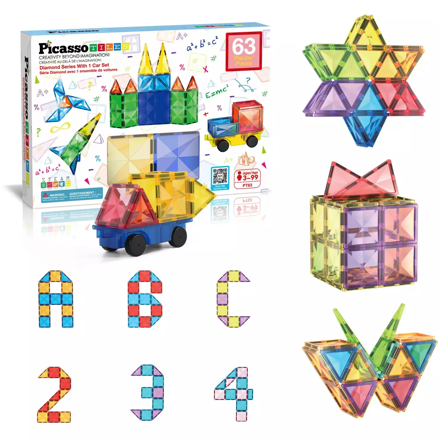 PicassoTiles 63-delars set erbjuder oändliga möjligheter för kreativt byggande. Bygg, lär och utveckla fantasin med magnetiska plattor!