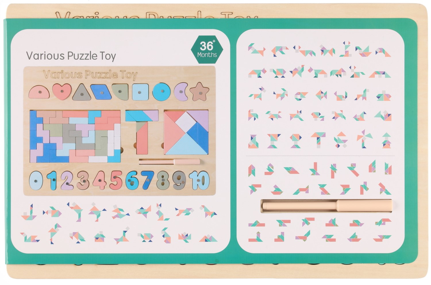 Träpussel med 5 spel i ett: 3 olika formpussel och siffror från ett till tio och former. Siffrorna och formbitarna har magneter. Åldersrekommendation 3+.