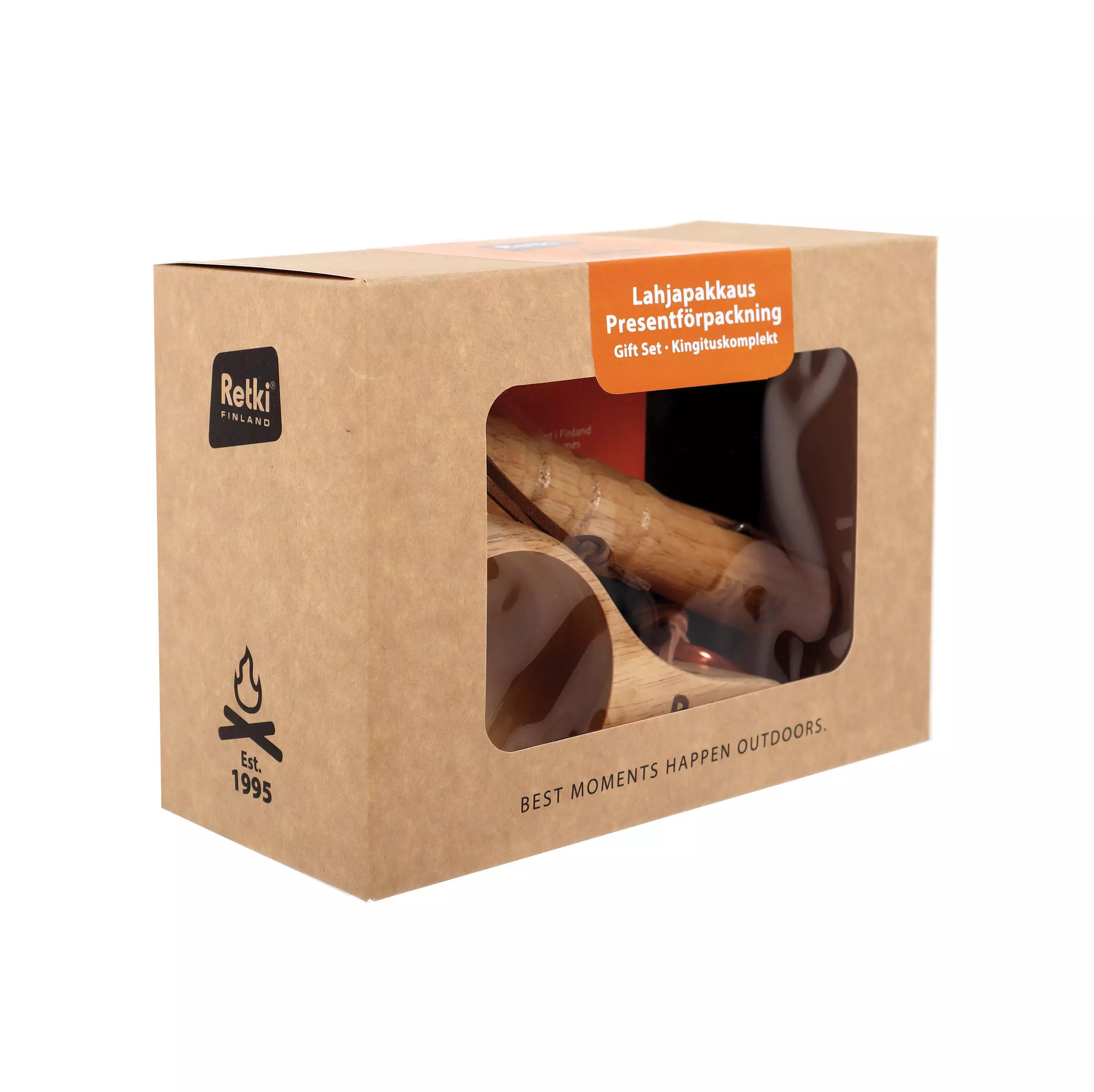 Lämplig för ett stugkalas eller som present till en friluftsentusiast. Paketet innehåller en 170 ml korvpinne i trä, en teleskopisk korvpinne med trähandtag och en hopfällbar sittdyna.