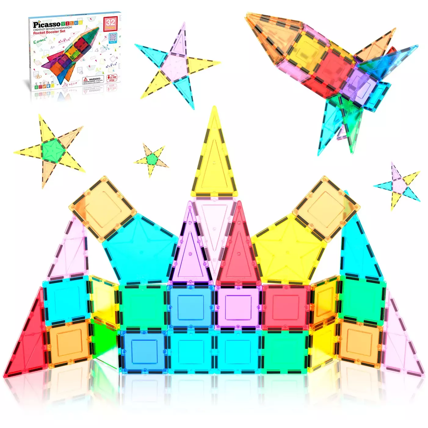 PicassoTiles Rocket Booster är ett 32-delars magnetiskt byggset som väcker kreativiteten till liv. Detta färgglada set erbjuder oändliga möjligheter för byggande, vare sig det gäller att konstruera en rymdraket eller ett eget kreativt projekt. Setets magnetplattor är olika formade och färgade och uppmuntrar barn att utforska geometri och arkitektur genom lek. Paketet inkluderar en idébok som vägleder i byggandet, men du kan också låta fantasin bestämma slutresultatet. Alla PicassoTiles-set är kompatibla med varandra, vilket möjliggör skapandet av ännu större konstruktioner.
