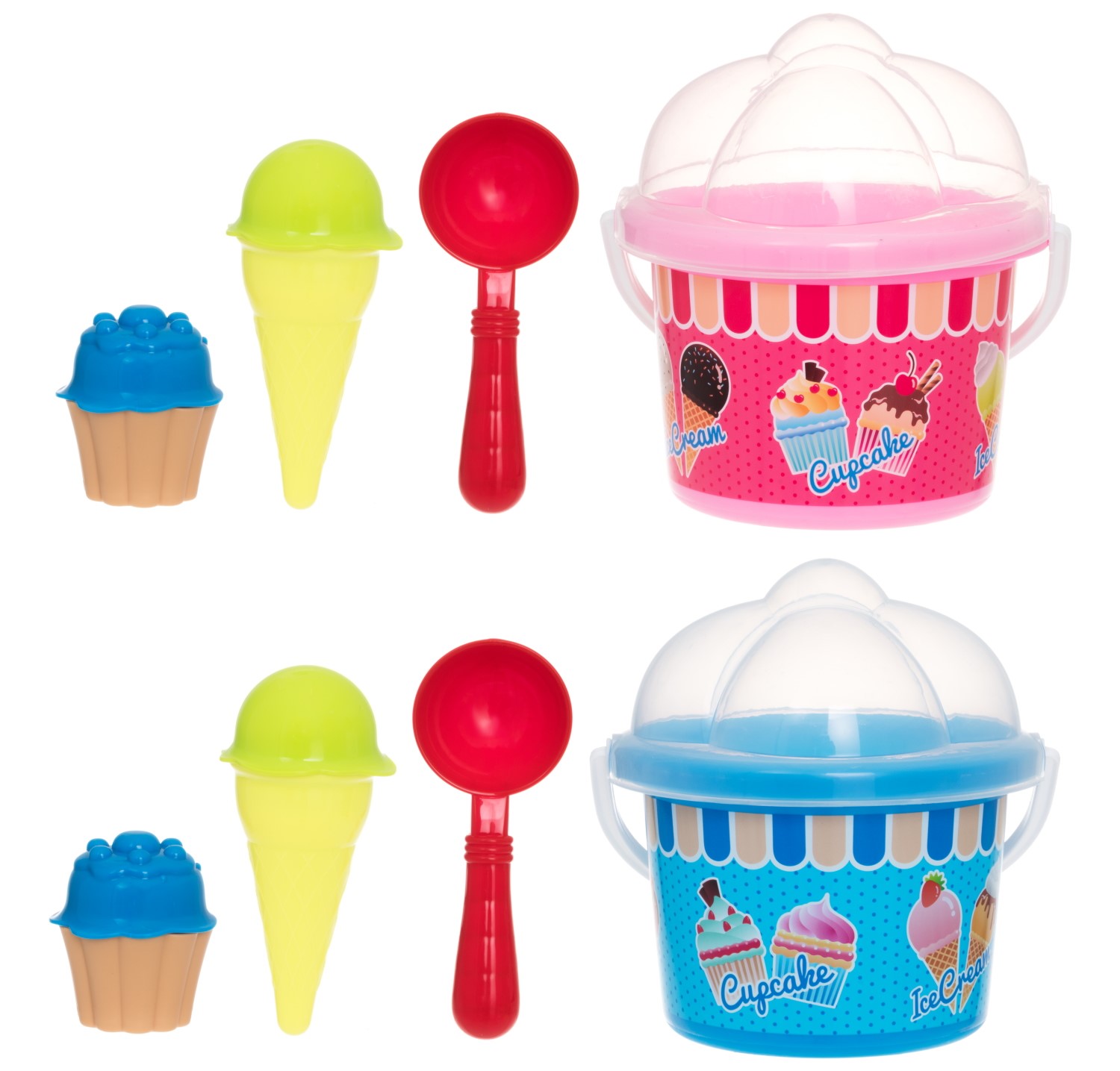 Finns i två olika färgset: en rosa hink eller en blå hink med tillbehör.