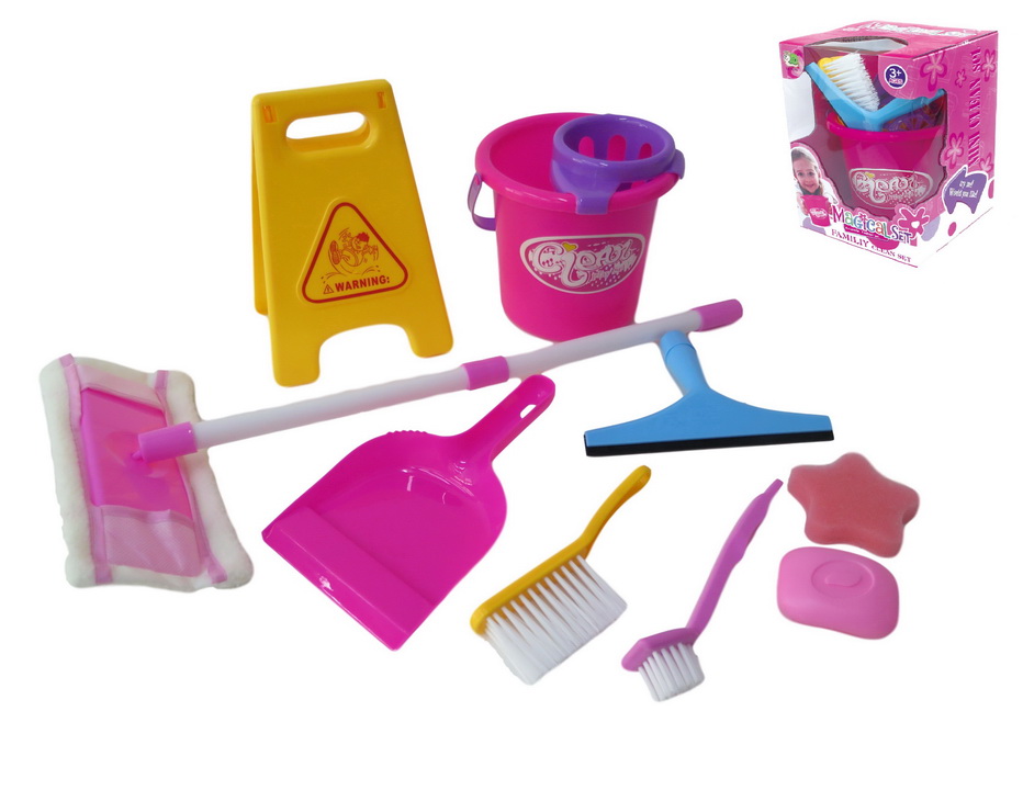 Den kompletta städutrustningen innehåller mopp, hink, varning för halt golv-skylt, borste och skyffel, fönstertork och diskutrustning.