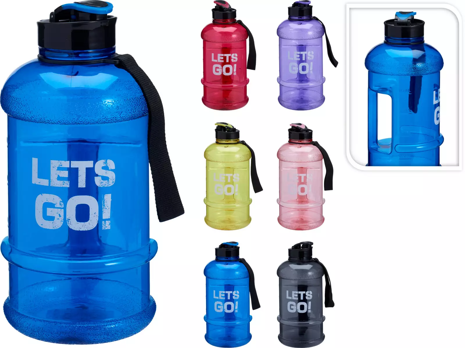 Den stora, vita texten “LETS GO!” på framsidan peppar inför både träningspass, jobbdagar och utflykter. Flaskan har en bred, cylindrisk form med praktisk greppöppning på sidan – smidigt när du håller den i handen eller packar den i väskan. Den integrerade svarta bärremmen gör det enkelt att ta med flaskan på gymmet, i bilen eller på promenaden.