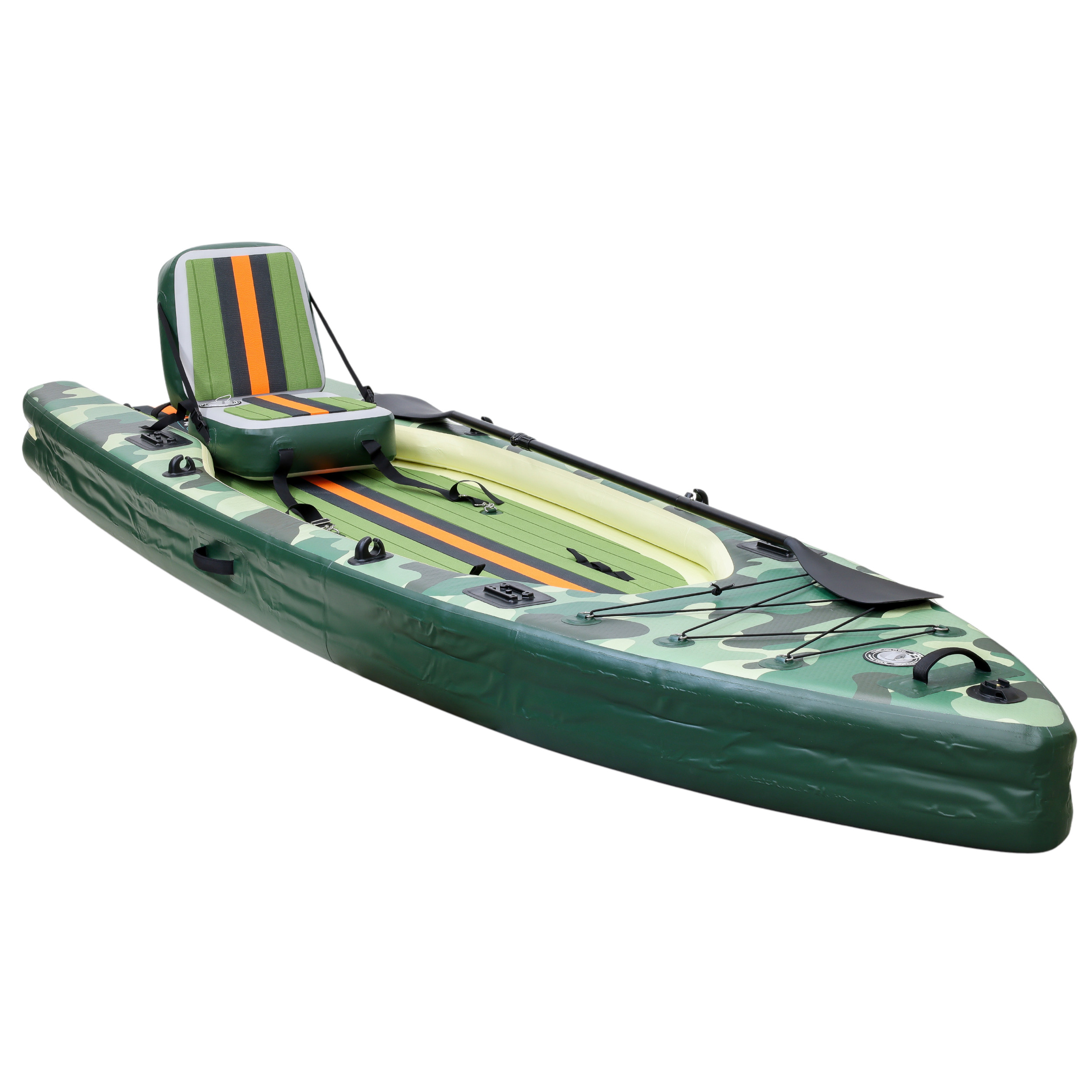 En högkvalitativ fiske-SUP-bräda har gott om plats och en lastkapacitet på upp till 150 kg. Det förstklassiga PVC-materialet är mycket slitstarkt och greppvänligt under fötterna. Den snygga gröna fiskebrädan är 368 cm lång, 105 cm bred och 28 cm tjock. I paketet ingår en bärväska, en reparationssats, en paddel och en pump. Ett justerbart säte, handtag och en separat fästpunkt för den elektriska utombordsmotorn garanterar brädans mångsidiga användbarhet.