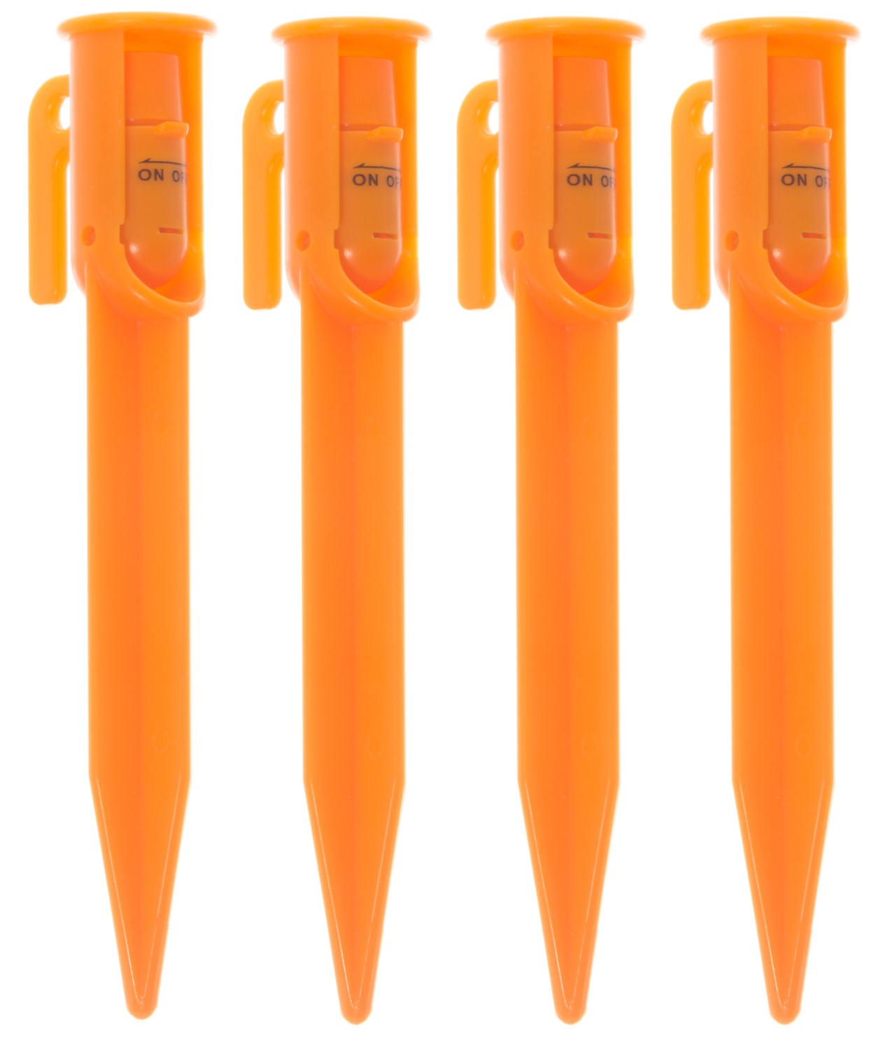 Tältpinnar av ABS-plast för att fästa ett lättare tält. Tältkrokar är till exempel lämpliga för att fästa ett litet 2-personers tält. Paketet innehåller fyra orange pinnar i plast för att fästa tältet.