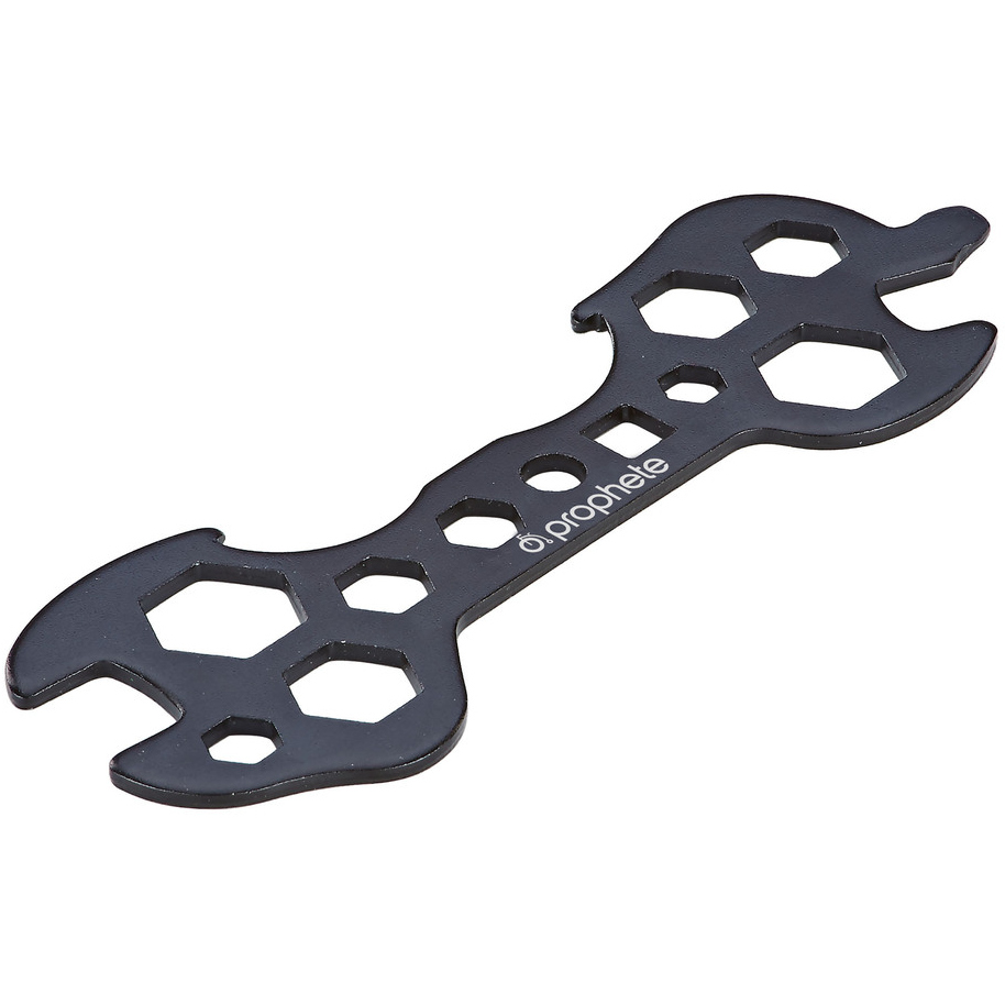 Mångsidig Prophete universalnyckel för cykling, 13 funktioner. Passar för nycklar mellan 7–17 mm, används även som däckavtagare och kroknyckel.