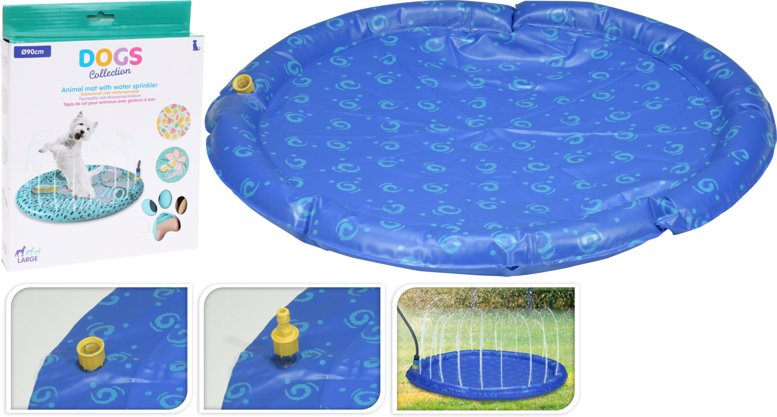 Uppblåsbar madrass för vattenälskande fyrbenta vänner. Poolen är enkel att installera, den behöver bara öppnas och anslutas till vattenslangen. När du slår på vattnet kommer poolen att fyllas med vatten och fontänen kommer att börja fungera. Den perfekta hundleksaken för sommaren. Uppfriskande sprinklers låter dig svalka dig och ha kul. Tillverkad av högkvalitativ plast och lätt att rengöra.