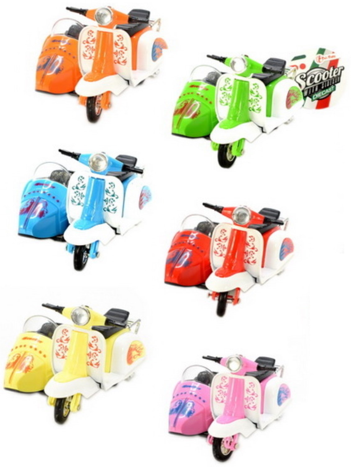 Retroskoter i metall med sidvagn. Åker framåt med en tillbakadragningsmekanism.