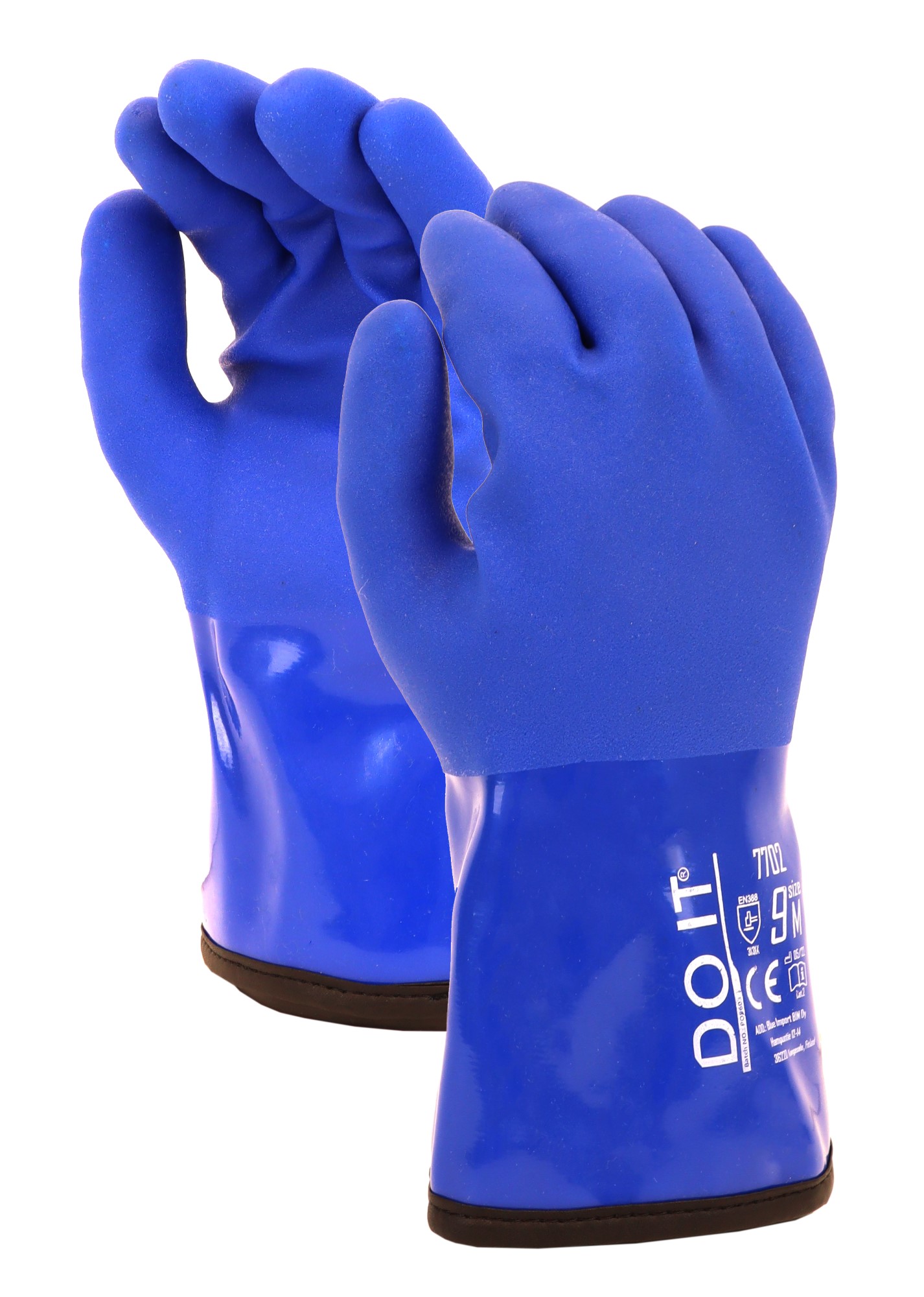 Vattentäta PVC-handskar med långa handleder lämplig för vinterfiskare. Den ruggade handflatan garanterar ett bra grepp och pälsen på insidan håller händerna varma.