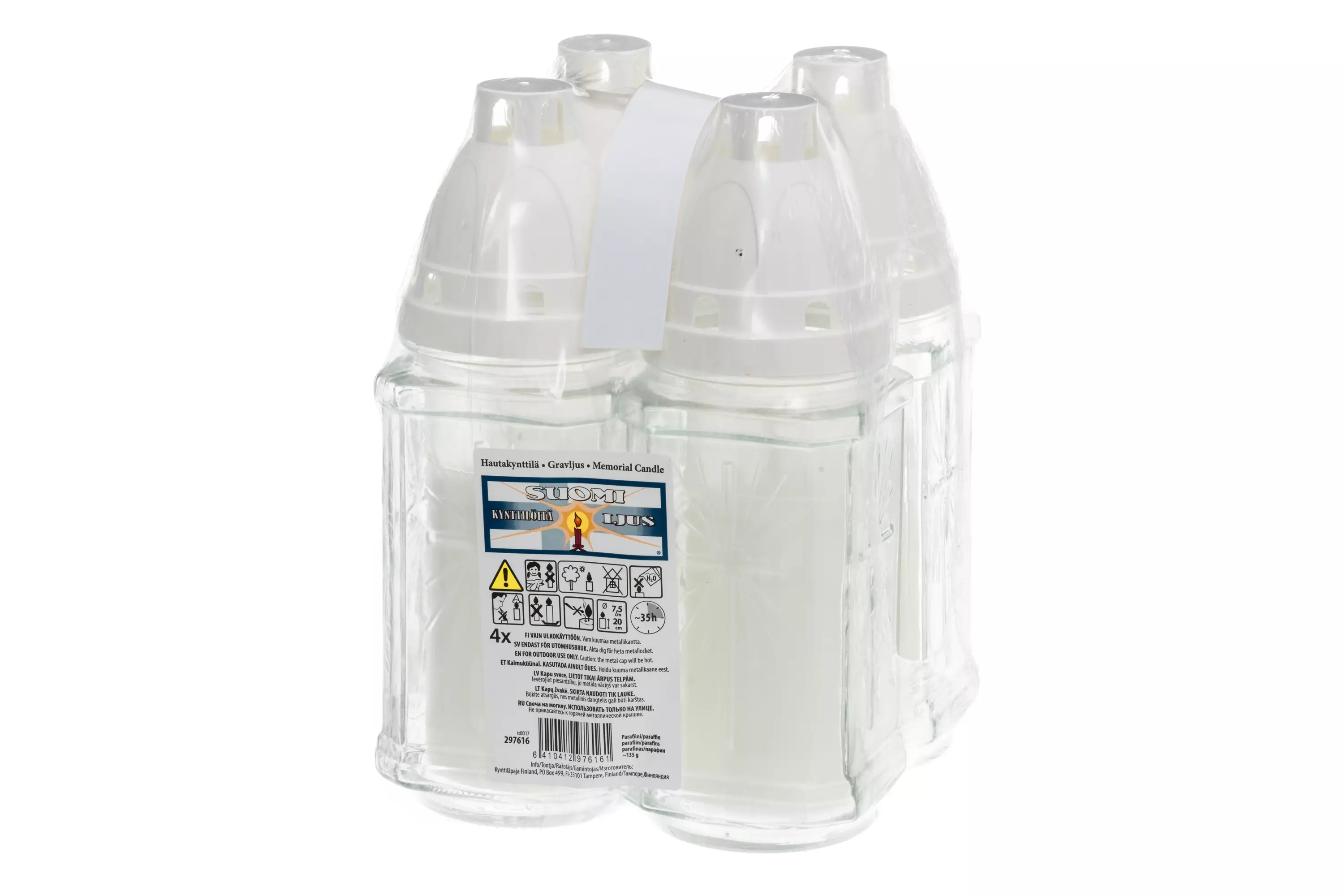 Gravljus 20 cm 4 st Storlek 7,5 x 20 cm Brinntid 35 timmar Glas gravstenlykta med kors, vit hatt Vikt 135 g Paraffinanvändning Krympförpackning med bärhandtag