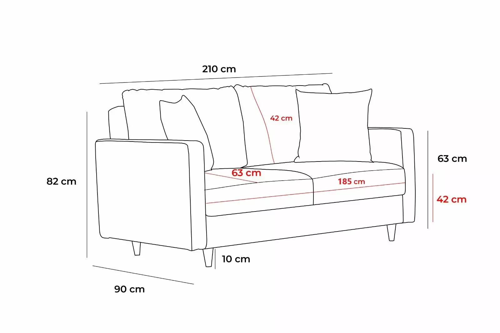 Med en bredd på 210 cm omvandlas denna soffa enkelt till en säng med måtten 185 cm x 140 cm, vilket ger en mysig sovplats för dina gäster. De eleganta benen lyfter soffan, vilket ger den ett modernt utseende.