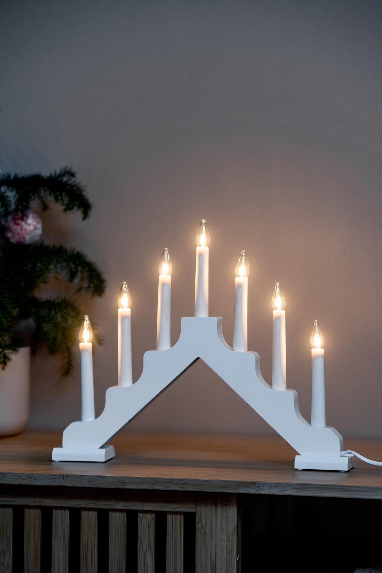 En traditionell vit träljusstake modell A. En modell i sju delar. Manschetter medföljer. Ljusstaken har utbytbara lampor. Använd den vackert glödande och eleganta reservlampan, nr 9478814 (34 V 3 W E10). Med denna lampa är ljusstakens ljus mycket naturligt och behagligt. Ljusstaken är avsedd endast för inomhusbruk. Strömkälla 230 V, strömbrytare på sladden.