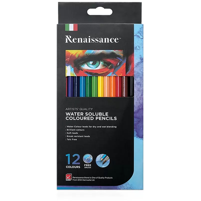 De högkvalitativa Renaissance akvarellpennorna ger mångsidighet till ditt konstnärliga skapande. Förpackningen innehåller 12 vattenlösliga färgpennor med mjukt och fylligt pigment och god ljusbeständighet. Dessa pennor kan användas som vanliga färgpennor eller i kombination med vatten för att skapa vackra akvarelleffekter och nyanser. Färglägg som vanligt och använd vatten för att sprida färgen, eller fukta underlaget och rita ovanpå. Genom att blanda olika färger med vatten kan du skapa nya nyanser och texturer. Förpackningen innehåller också en pensel för att enkelt kunna sprida färgen och skapa mjuka övergångar.