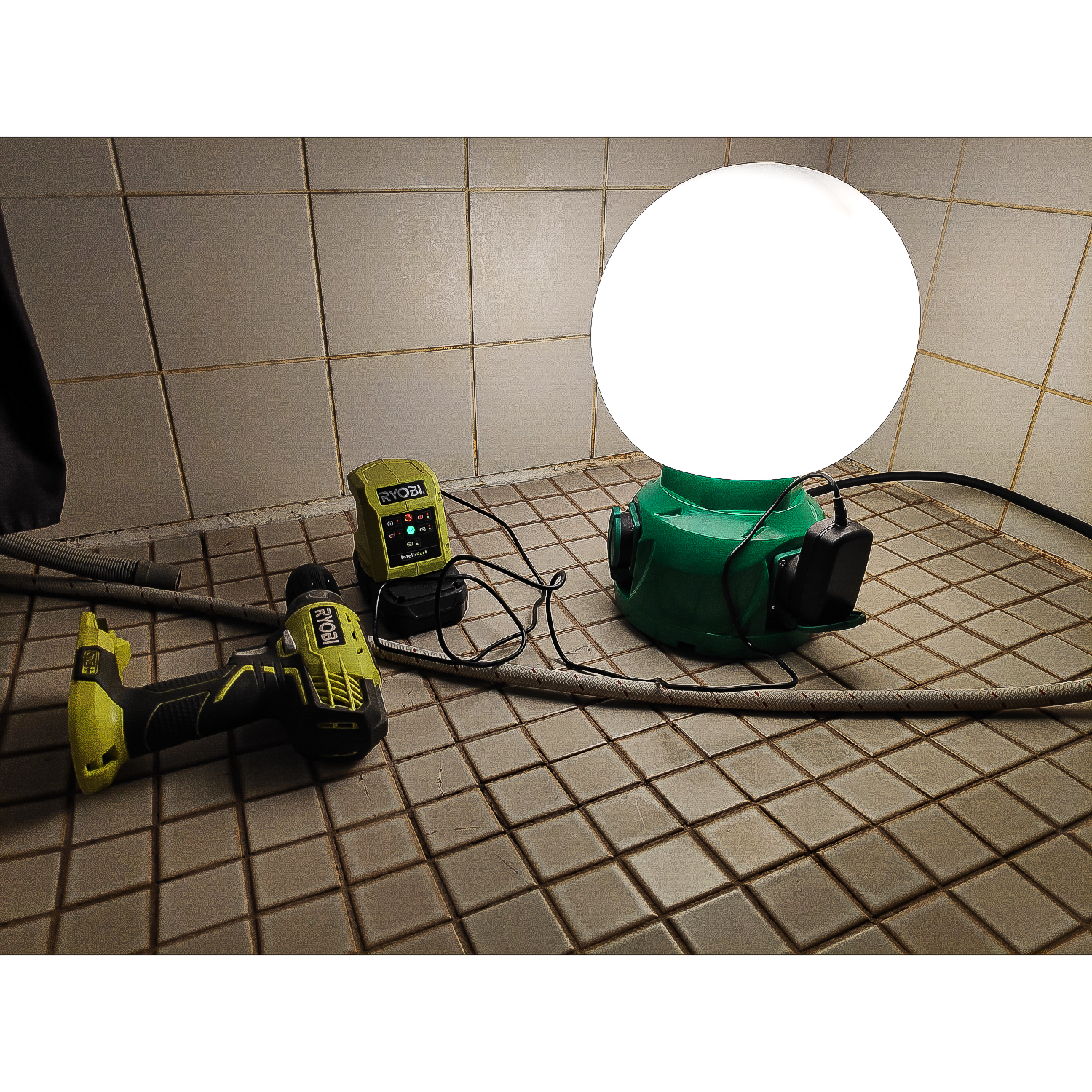 Denna arbetsbelysning ger 360 graders jämnt ljus runt sig. En väl upplyst arbetsplats garanterar arbetets kvalitet och säkerhet. Tack vare kroken kan den även fästas i taket. 2 x schuko-uttag för fler arbetslampor eller verktyg.