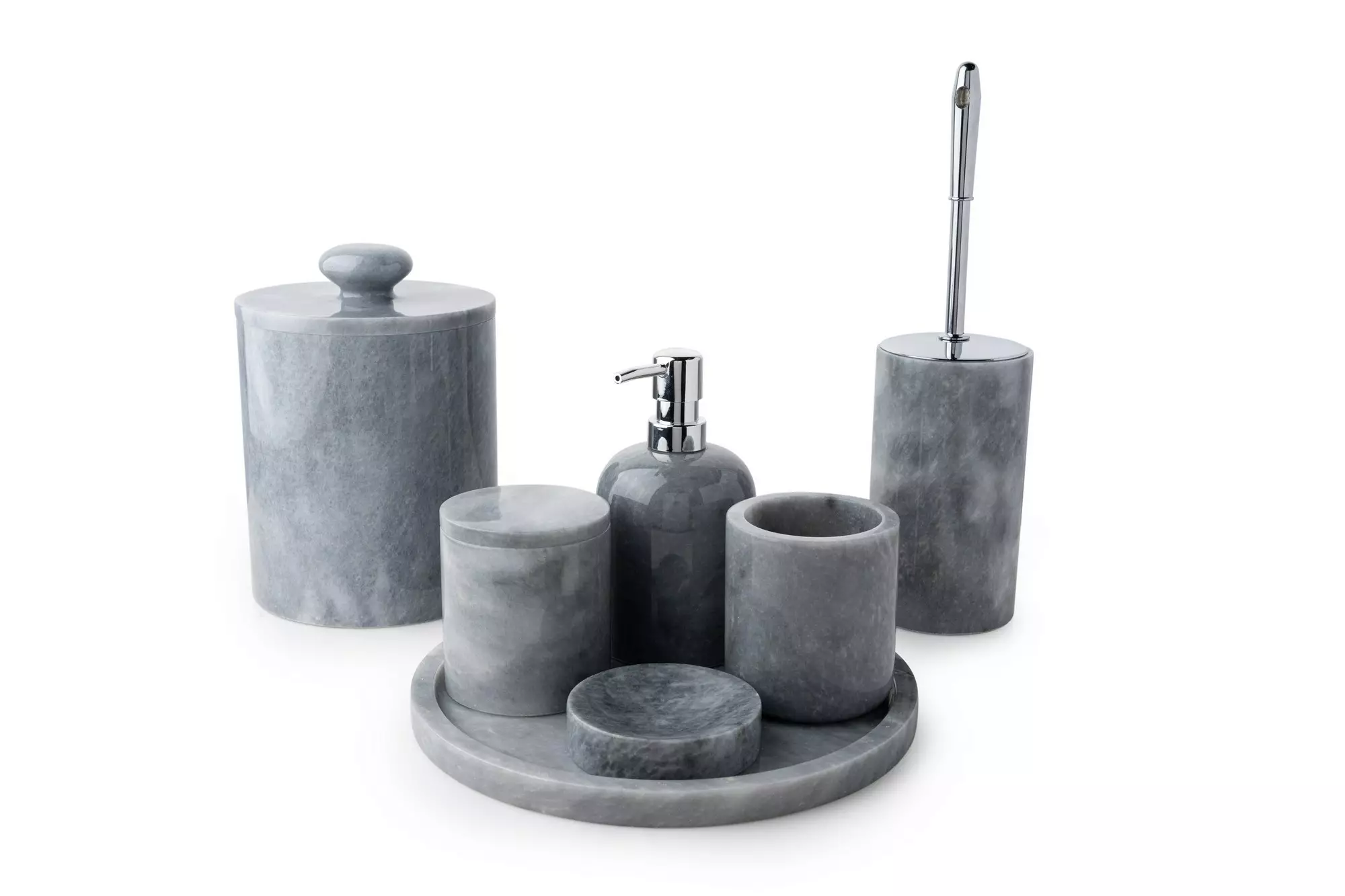 Detta praktfulla set innehåller en toalettbricka, tvåldispenser, tandborsthållare, q-tiphållare, bartvålhållare, papperskorg och toalettborsthållare, alla tillverkade med omsorg om kvalitet. Den eleganta grå marmorn tillför en touch av modernitet och stil till ditt badrum, vilket gör det till en viktig del i varje hem.