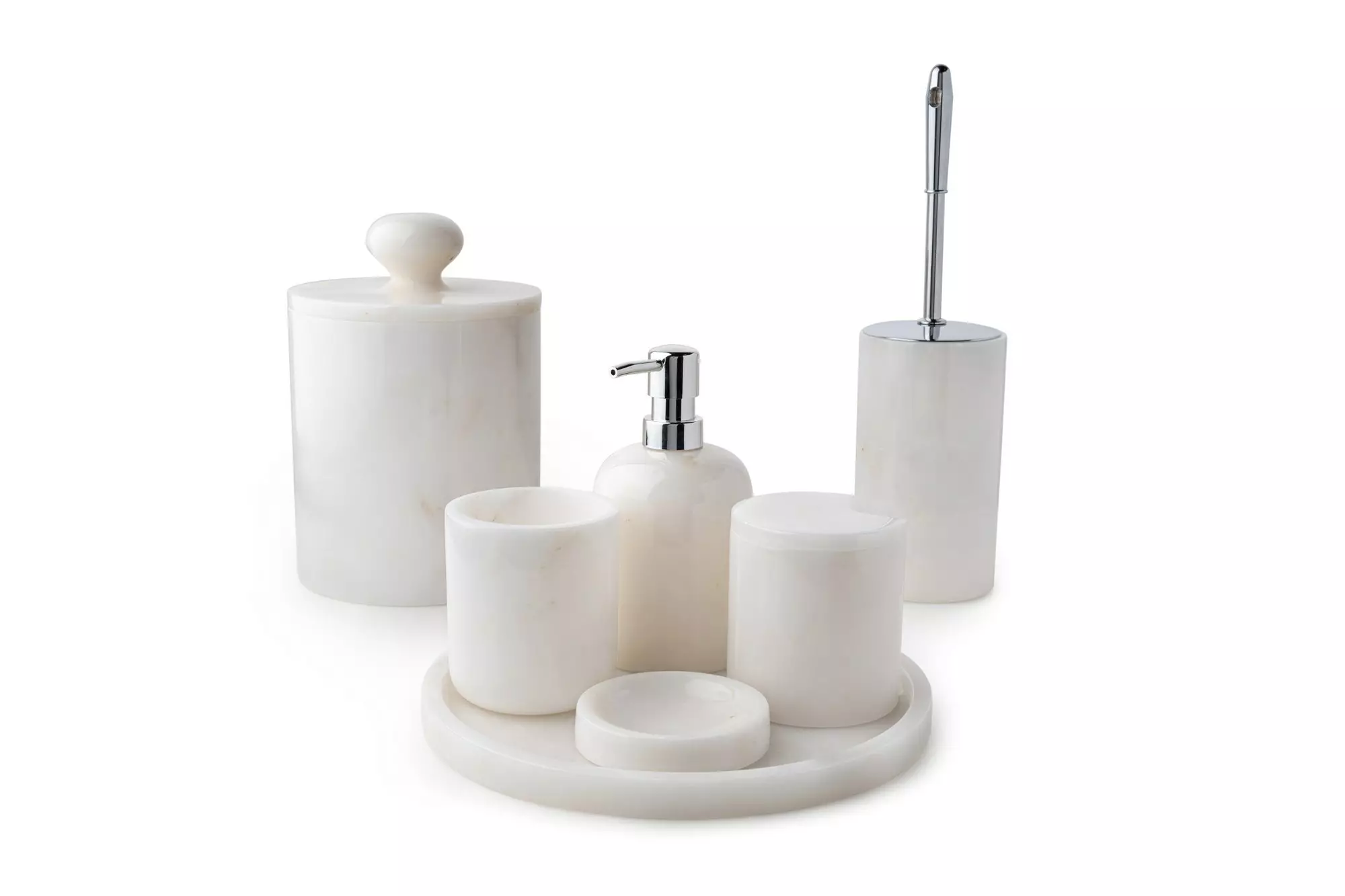 Säg adjö till vardagliga badrumstillbehör och hej till en uppsättning som utstrålar överflöd. Den eleganta designen och den rena vita färgen på thassos-marmorn kommer omedelbart att höja utseendet på ditt badrum, vilket gör det till ett utrymme du kommer att älska att tillbringa tid i.