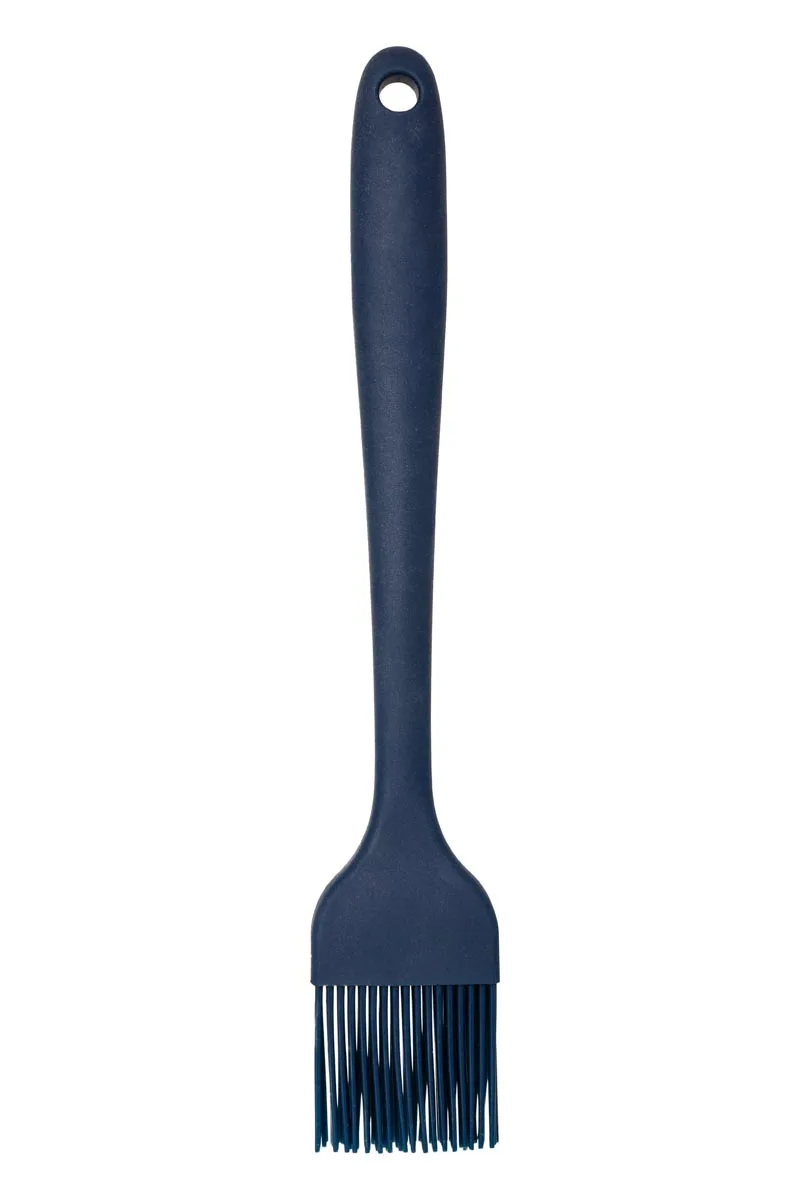 Stilfull mörkblå bullpensel, 27 cm lång. Penseln är gjord av silikon och kan tas av från det trähandtaget. Penseln tål maskindisk, och på handtaget finns ett litet hål för upphängning. Silikonpenseln passar för att smörja bakverk och formar samt för att applicera marinader. Den tål värme väl, men bör inte användas direkt på spisen, i grillen eller över öppen eld. Praktisk hjälp i matlagning och bakning.