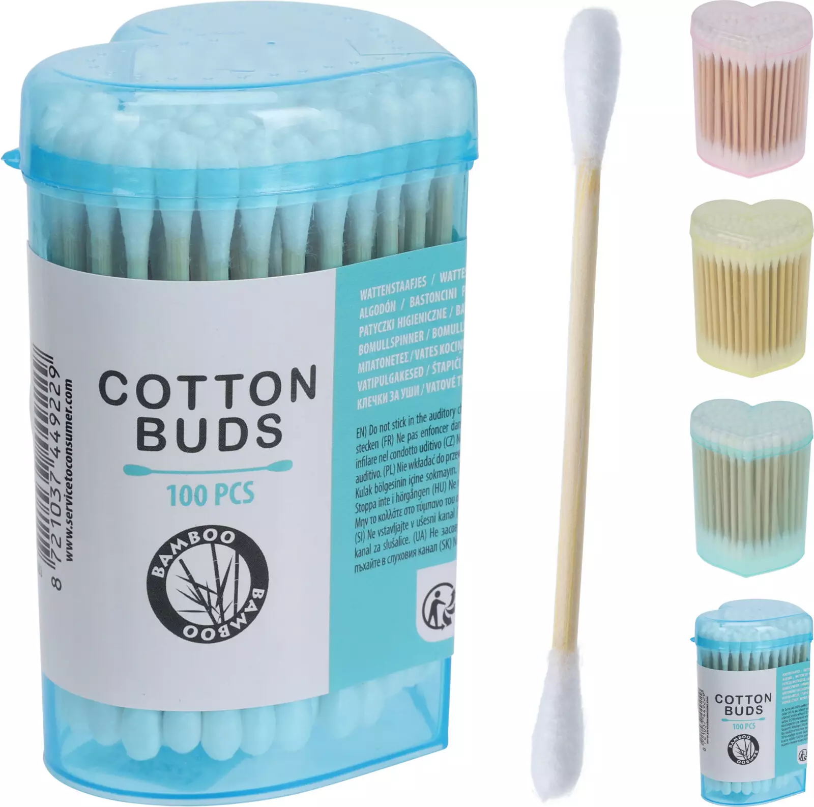 Bambupinnar med bomullstops i hjärtask, 100 st. Tillverkad av bomull. Produktens nettovikt: 26g. Tillverkningsland: Kina. Leveransen innehåller en produkt/förpackning.