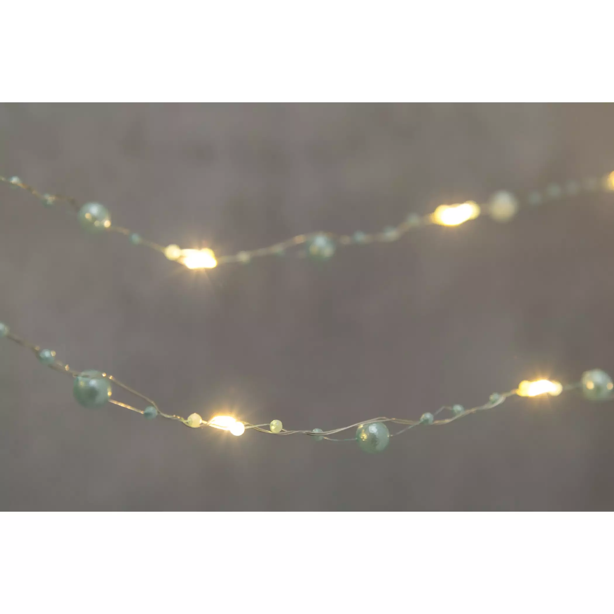 Ljusblå LED-ljuskedja med pärlor, längd 2 m. Varmvita LED-lampor. Endast för inomhusbruk.