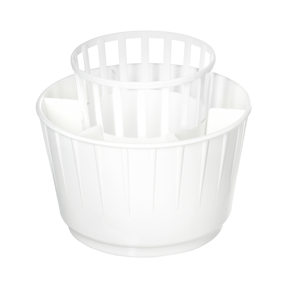 Ett praktiskt torkställ för bestick och köksredskap. Den runda plasthållaren har flera fack och en löstagbar innerdel.