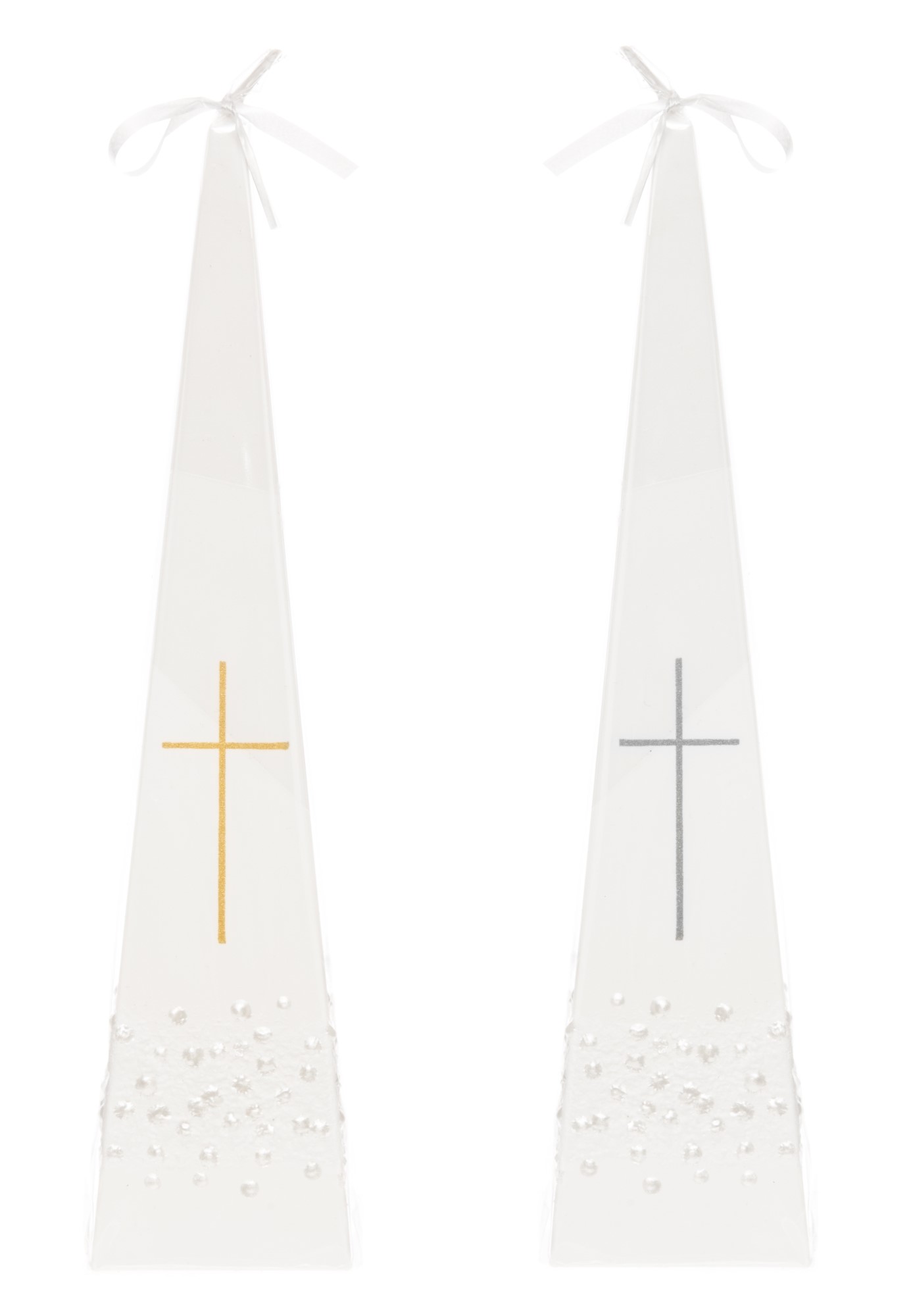 Brinntid ca 38 timmar. Handmålat bordsljus med kors på bilden (guld/silverkors). Cellofanförpackning med rosett.