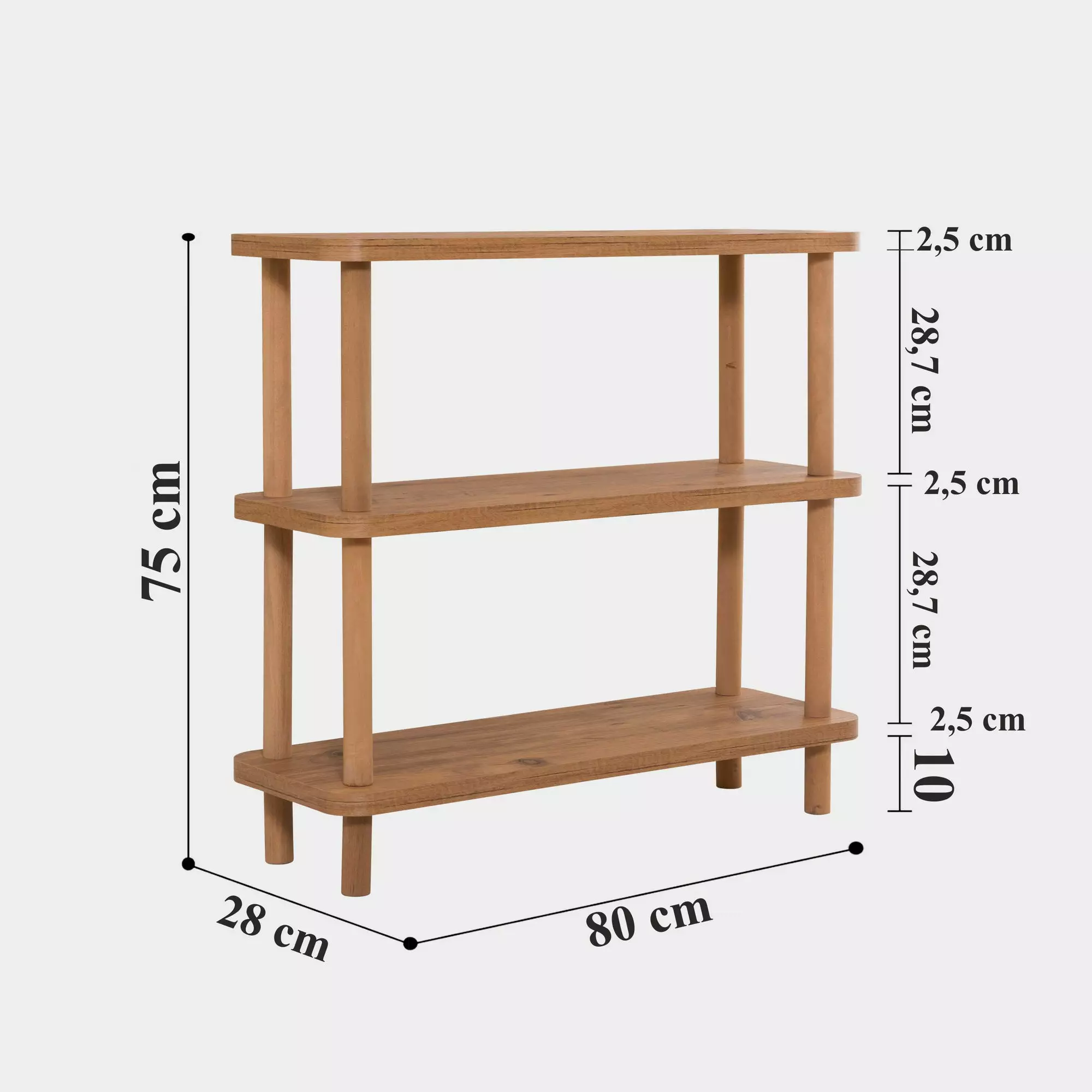 Med inga verktyg som krävs för montering är det en barnlek att sätta upp denna bokhylla. Hyllans bärkapacitet på 20 kg gör att du kan visa dina favoritböcker, foton och dekorationsföremål utan bekymmer. Med en bredd på 80 cm, höjd på 75 cm och djup på 28 cm erbjuder den gott om förvaringsutrymme, medan hyllhöjden på 28,7 cm och benhöjden på 10 cm ger en balanserad och visuellt tilltalande design.