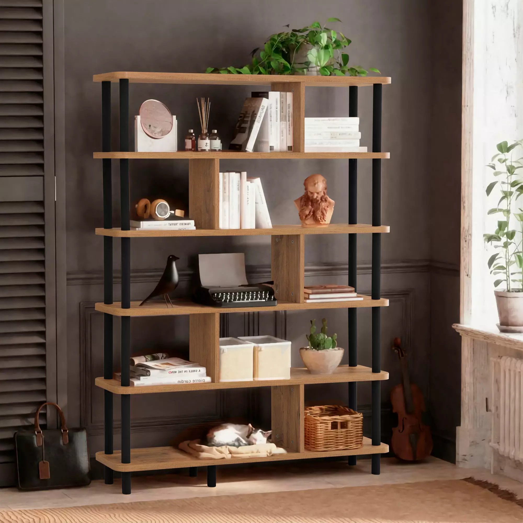 Denna bokhylla är tillverkad med känsla för detaljer och kombinerar traditionella, rustika, skandinaviska och skolinspirerade element för att skapa en verkligt unik pjäs. Den varma färgen Atlantic Pine ger en touch av naturlig skönhet, medan de eleganta svarta accenterna ger en modern twist.