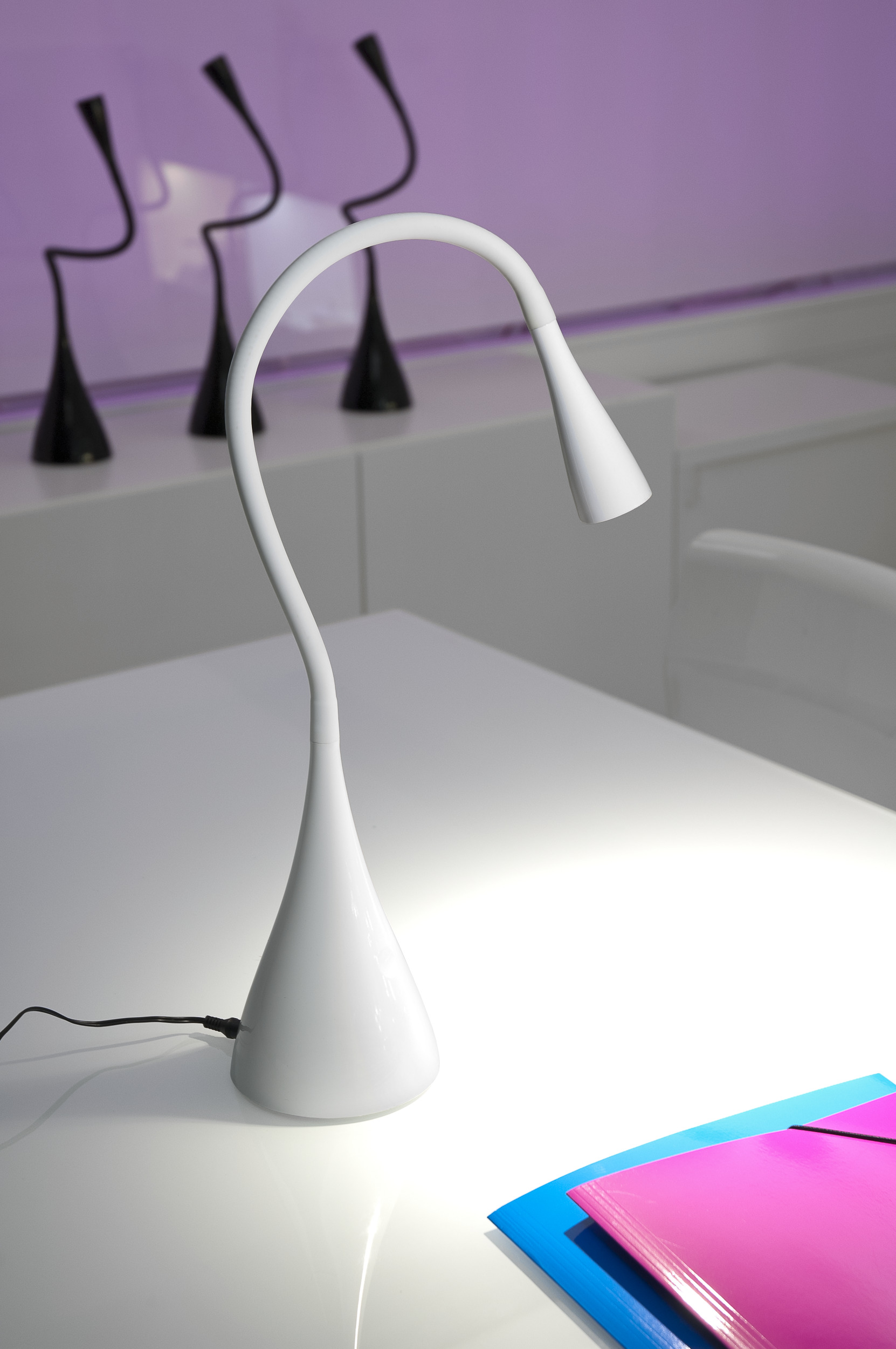 LED-bordslampa med ett flexibelt plast huvud, där ljuset kan riktas precis där det behövs. En praktisk strömbrytare med en treports dimer!