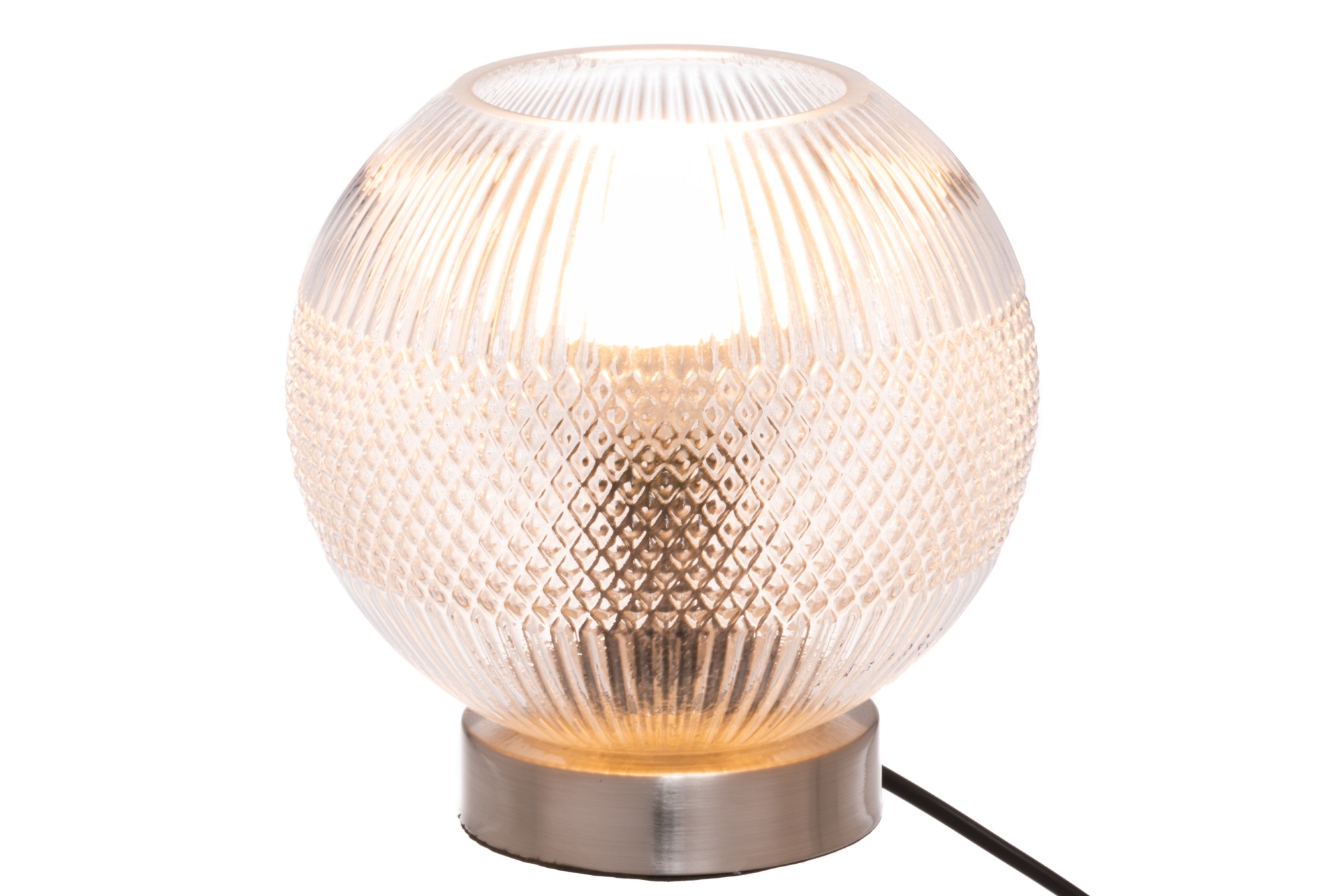 Bordslampan Ball kombinerar en vacker dekorativ kupol av klarglas och en stilren stålfot.