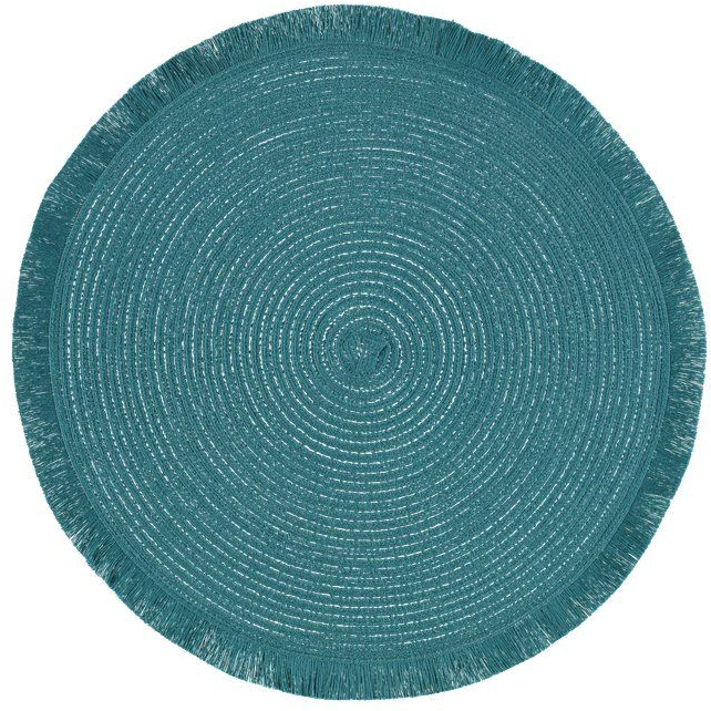 Rund turkos bordstablett med franskant, diameter 38 cm. Skyddar bordets yta mot stänk och repor. Material 100 % polyester.