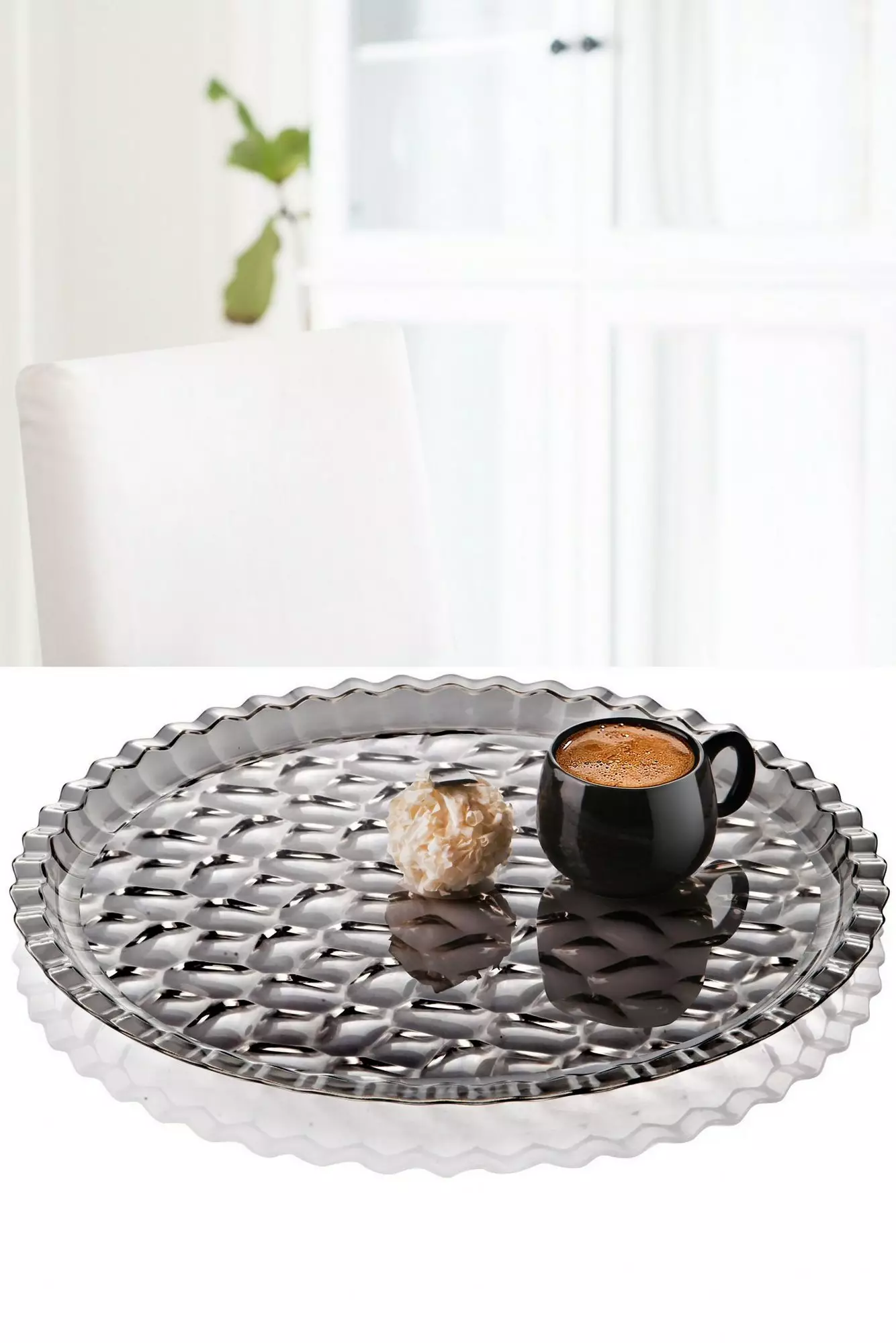 Tillverkad av högkvalitativ akryl är denna bricka inte bara hållbar och robust, utan också lätt att rengöra och underhålla. Den rökiga färgen tillför en touch av sofistikering till vilken miljö som helst, vilket gör den till den perfekta accessoaren för varje modernt hem.