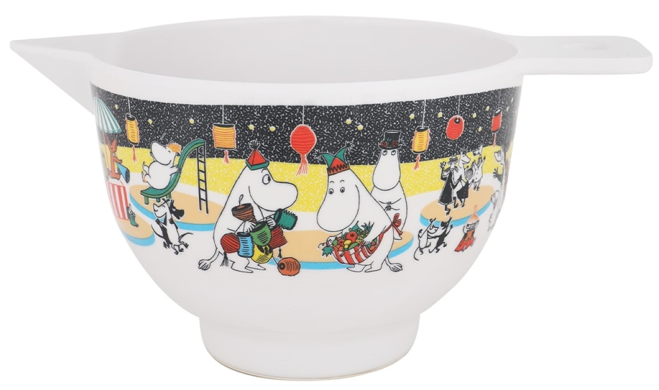 Bunke i melamin med praktisk pip, handtag och ett litet hål för upphängning. Längst ner på den stora bunken finns en ring av gummi som håller bunken på plats. Volymen på bunken i S-storlek är 1 liter. Bunkens grundfärg är vit, och i dess illustration förbereder folket i Mumindalen sig för höstfesten. Med bunken förbereder du pannkakssmeten, andra bakverk och kan även förvaras på bänken i köket. Det ger glädje till att dekorera, laga mat och baka.