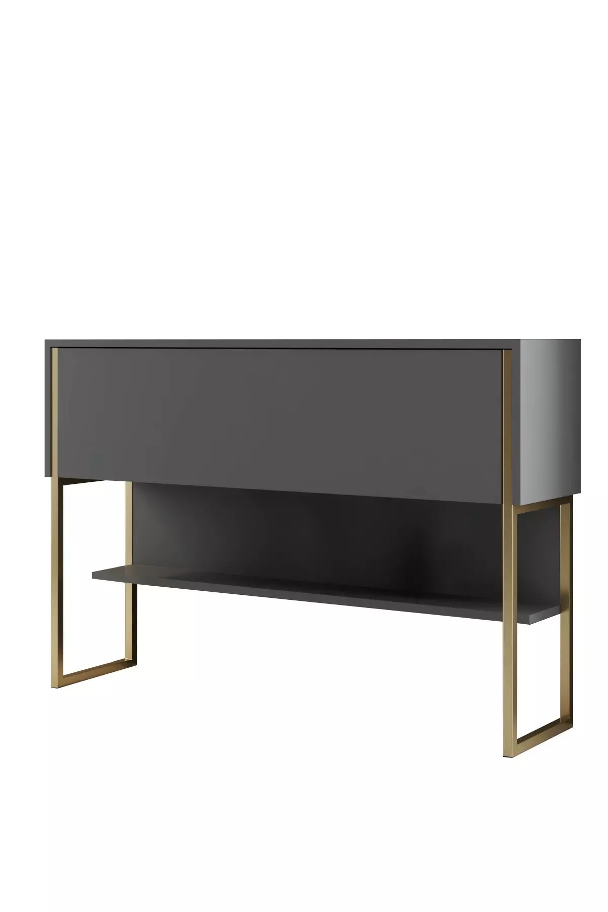 Byrån är designad med en elegant och modern estetik, med en vacker kombination av guld- och antracitfärger som omedelbart lyfter utseendet i alla rum. Metallbenen ger en touch av glamour och stabilitet, vilket gör den till ett perfekt komplement till din heminredning.