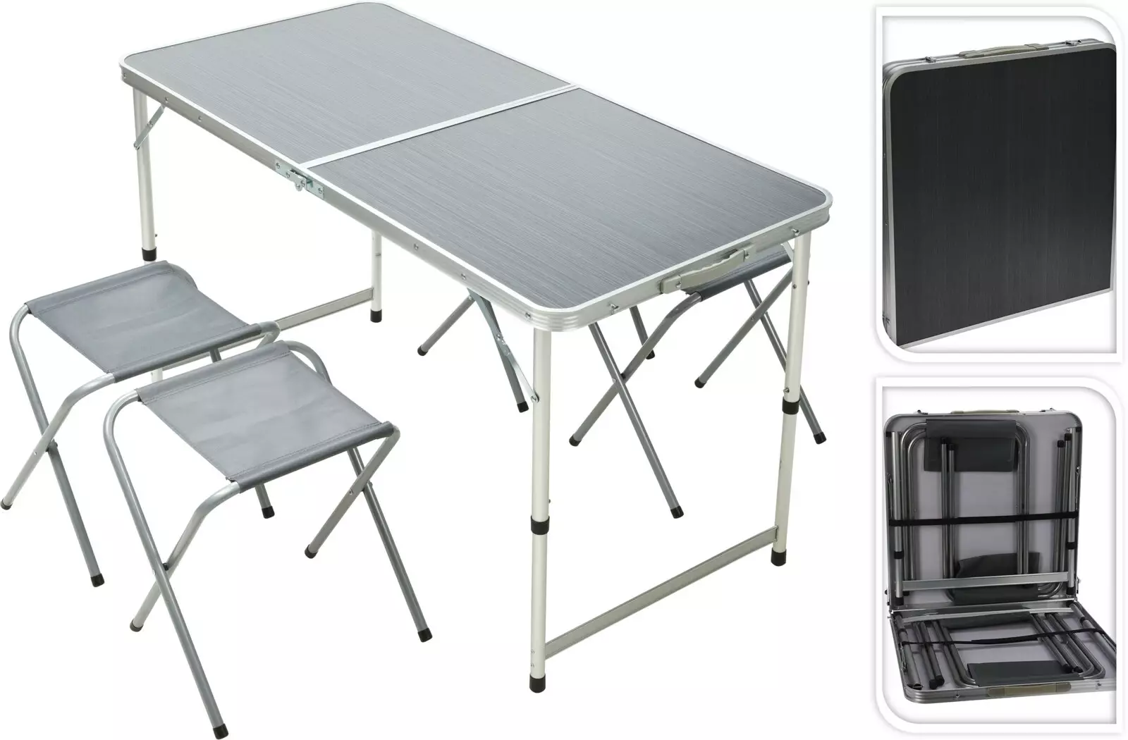 Detta praktiska och stiliga campingbordset innehåller ett hopfällbart aluminium bord och fyra hopfällbara stolar. Bordets storlek är 120x60 cm, och dess höjd kan justeras till tre olika nivåer... Läs mer