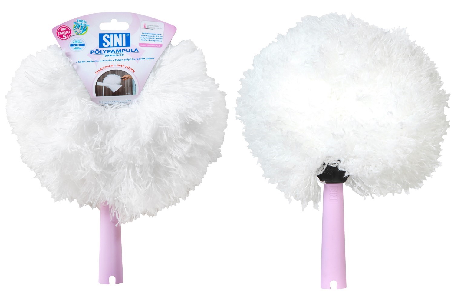 Den rosa och silvriga dammvippan tillhör Rosa Bandet-produkterna, för vars försäljning skänker vi 0,25 € / produkt till Rosa Bandet.