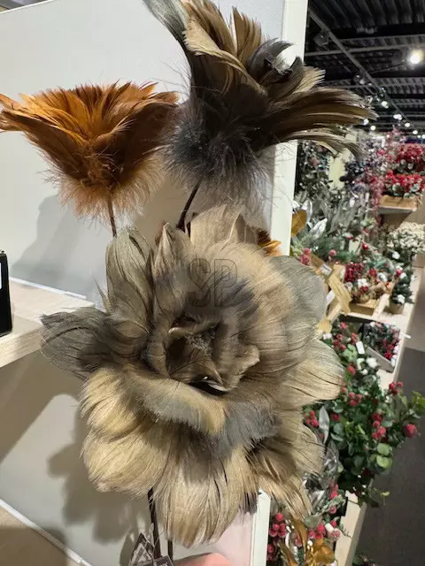 Denna fantastiska Flower of Feathers-dekorationsblomma ger ditt hem en mjuk lyx och en naturnära känsla. Varje stjälk är tillverkad av äkta gåsfjädrar som har formats till tre imponerande blomhuvuden i änden av en stadig järnstjälk. Blommans totala längd är 65 cm, vilket gör den till ett idealiskt val för en vas, arrangemang eller som en enskild inredningsdetalj.