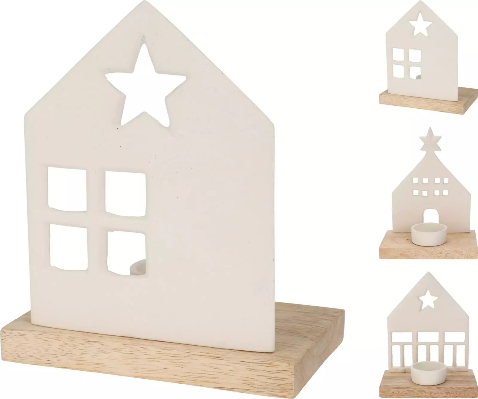 Dekorativ vit husformad värmeljushållare med träbas – varm stämningsbelysning för hemmet