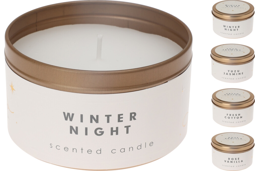 Doftljus 'Starlight', i en gyllene metallburk, 2 procent doft, storlek: 8x5 cm, vikt: 125 gram, 6 olika dofter, urval: 6 dofter (Winter Night, Fresh Cotton, Yuzu Jasmine, Rose Vanilla, Vanilla , kardemumma cederträ)