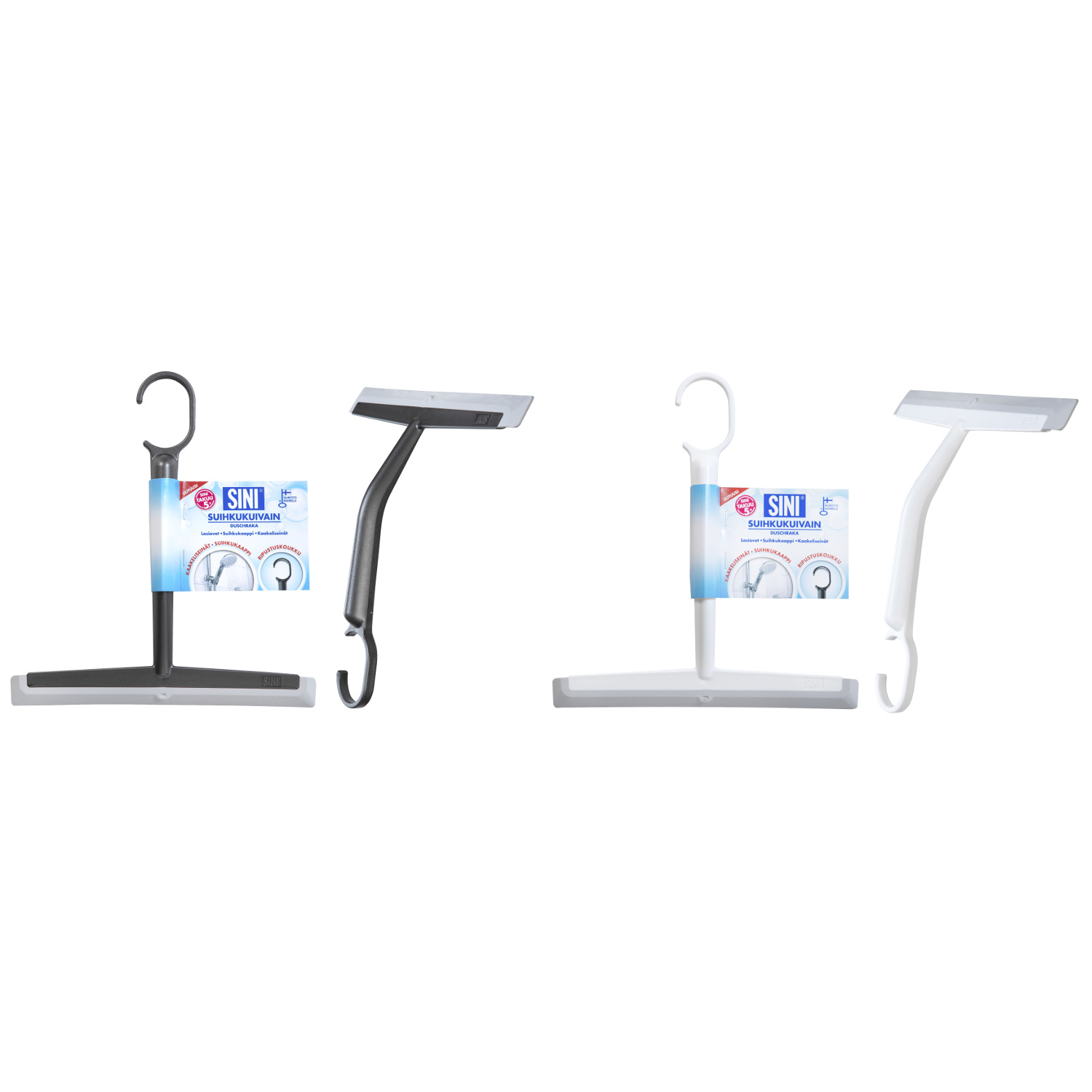 SINI Duschtorken är en lätt, praktisk torkare. Det gör det enkelt att torka glasdörrarna och väggarna i badrummet och bastun, duschkabin, de kaklade väggarna och speglarna. Torken har en mjuk elastomer torkdel som följer ytan som ska torkas och inte repas. Torkaren har en bekväm hängkrok, från vilken den är lätt att hänga även från duschrören. På detta sätt är torkaren alltid tillgänglig för handen efter duschen.