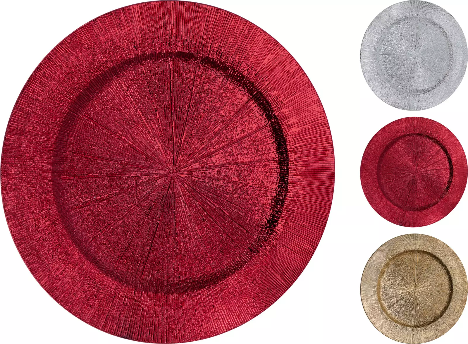 Lägg till en touch av lyx på ditt festbord med dessa fantastiska texturerade laddningstallrikar. Tallrikens strålande, solstråleliknande mönster och glansiga yta reflekterar ljuset vackert och skapar en imponerande och elegant dukning för varje tillfälle.